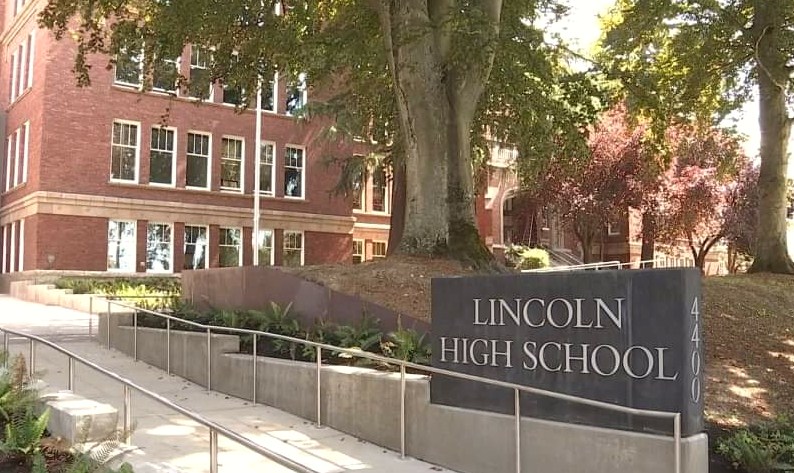 The new walkway leading up to the level-entry main door of Lincoln High School. In the background is the original main entrance in the central wing. Photo by Valarie.