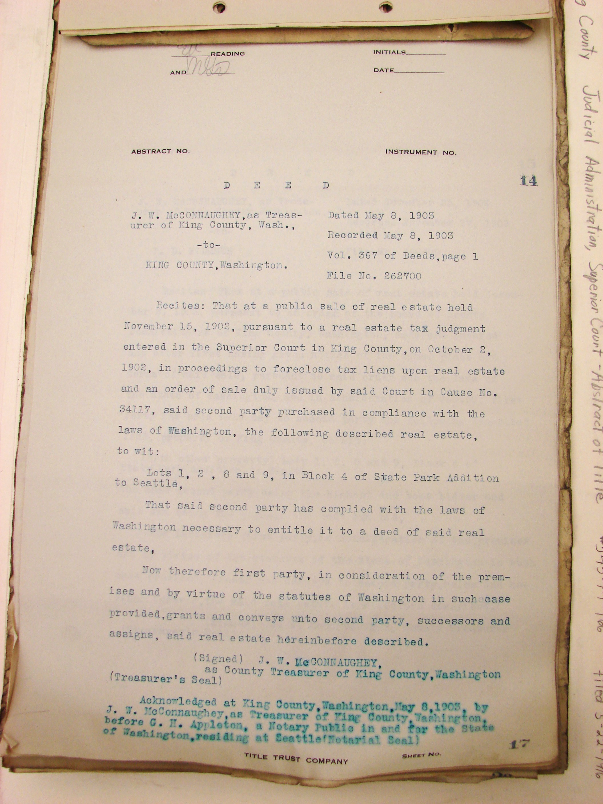 Here is one of the real estate tax judgment documents for Baker’s State Park properties. These lots were foreclosed for tax liens in 1903 and were sold at auction. Document in the State Park Title Abstract, Puget Sound Regional Archives, Bellevue, WA.