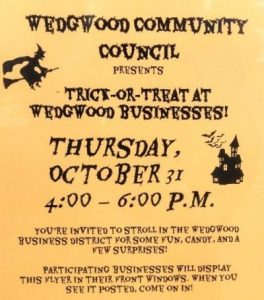 Each year the Wedgwood business district says “thank you” to the community by organizing for trick-or-treat from 4 to 6 PM on Halloween, October 31st.
