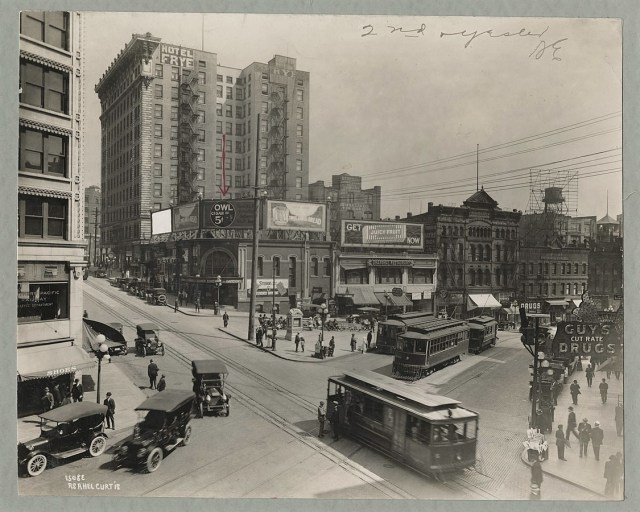 Streetcars at Second and Yesler circa 1915 to 1919. At left is the Smith Tower which was completed in 1914. At center background is the Frye Hotel which is still there today. The low-rise building in the foreground was the location of Don’s Oyster House, facing Yesler Way where the cars are parked at the curb. Photo by Asahel Curtis courtesy of the Seattle Public Library and Wikimedia.