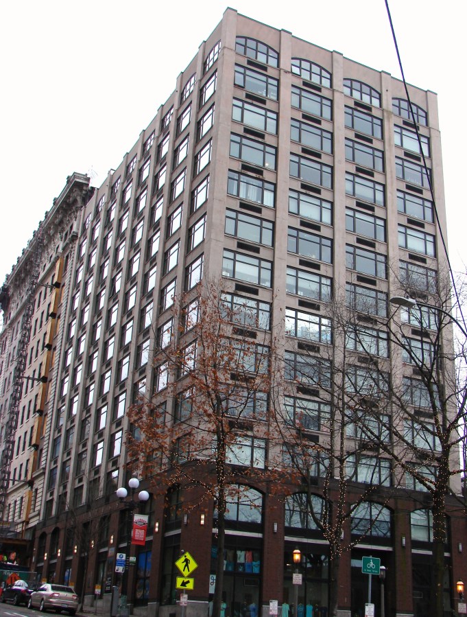Don’s Oyster House (gone now) was at 201 Yesler, on the south side of the street from the Smith Tower. At left is the Frye Hotel. Photo by Valarie, November 2019.