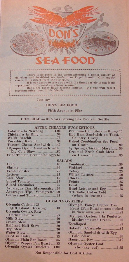 Don’s Sea Food menu of 1936. The restaurant was at 1429 Fifth Avenue (southwest corner of Pike Street). Menu in the Seattle Room Collection, Seattle Public Library.
