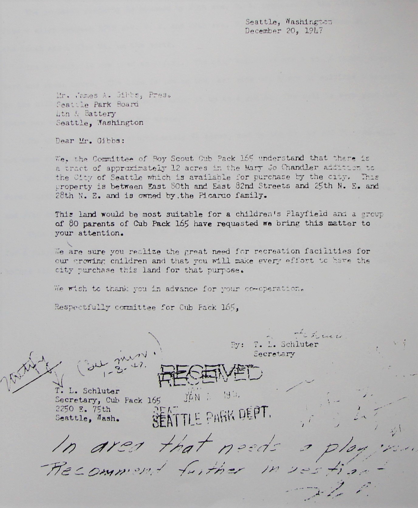 Parents of Cub Pack 165 wrote to the Parks Board of Seattle, requesting playfield space.