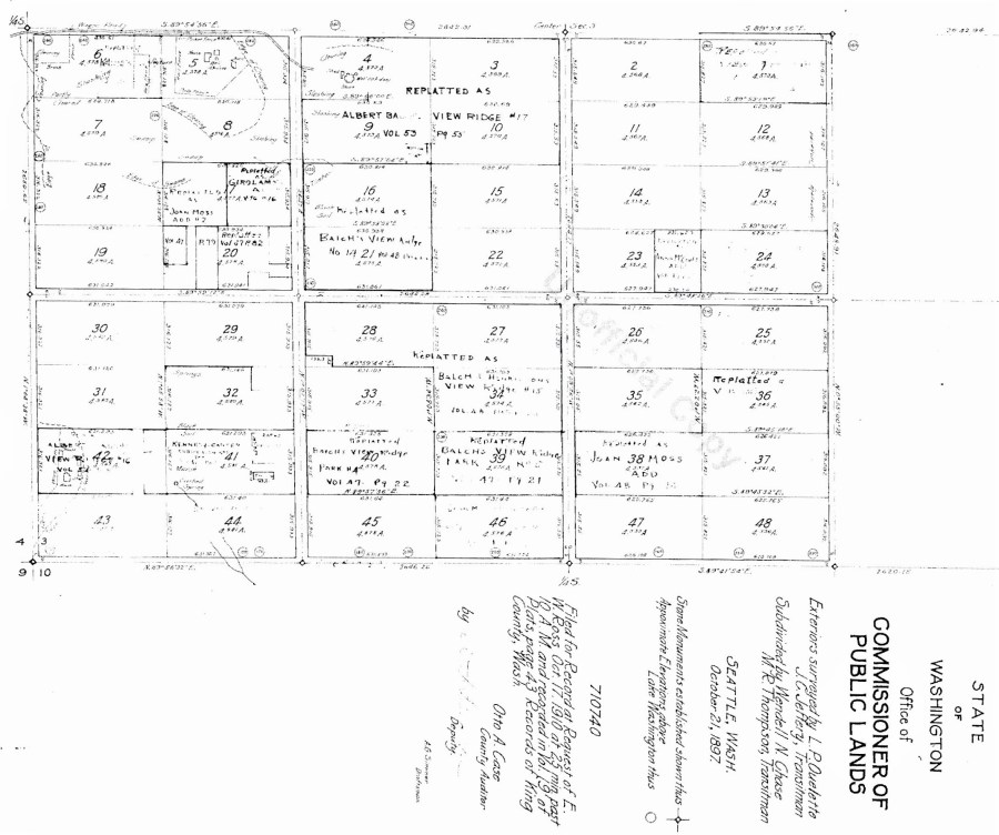The Commissioner of Public Lands plat was filed in 1910. The left margin is 35th Ave NE and the right margin is 50th Ave NE. The bottom line is NE 65th Street and the top line is NE 75th Street.
