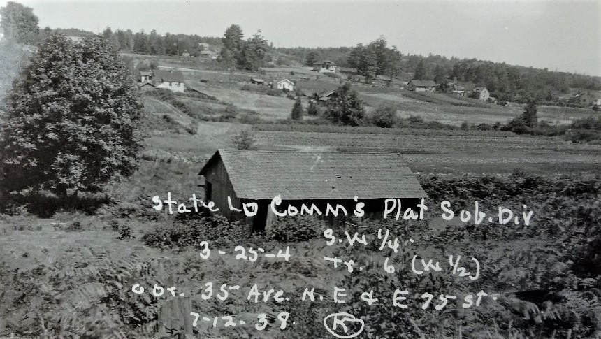 In 1938 the King County property survey showed a chicken house or barn on what later became the site of the Wedgwood Safeway store. We are looking east with NE 75th Street at the left. Photo courtesy of Puget Sound Regional Archives.