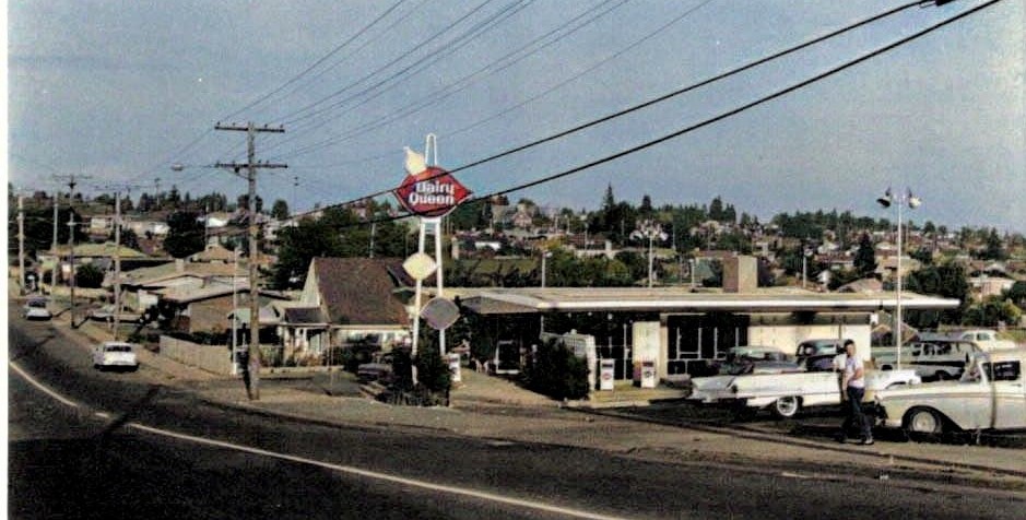 Dairy Queen looking eastward along NE 75th Street, when the store was on the site of the first Safeway. Photo courtesy of Don Morgan who lived in the house at left, 3603 NE 75th Street.