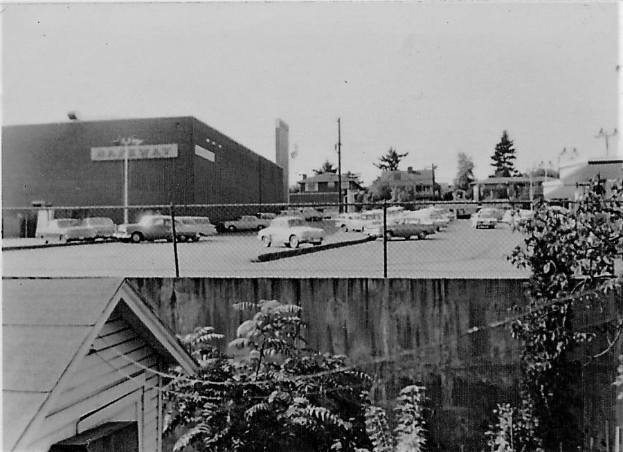 Don Morgan took this photo from his house at 3603 NE 75th Street, looking up over the retaining wall to the first Wedgwood Safeway which had been built in 1951.