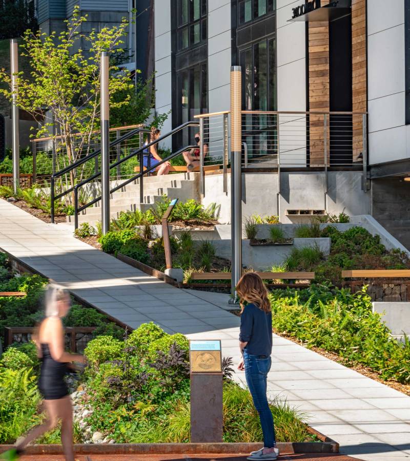 Alongside the Watershed Building, 900 North 34th Street, is a sidewalk and bioswales underneath the Aurora Bridge. Photo courtesy of Weber Thompson architecture.