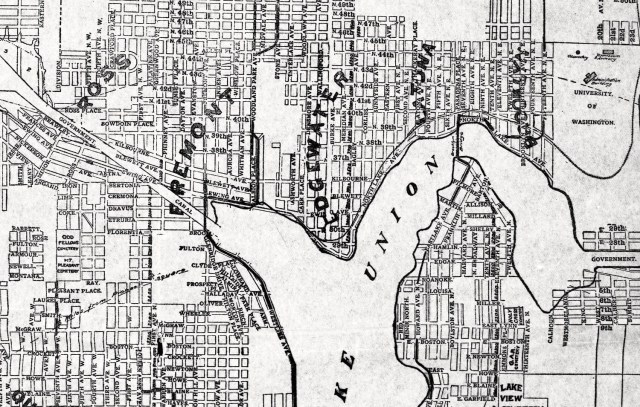 On the map below, the railroad line can be seen on the north shore of Lake Union, passing through communities that had railroad stops. At top right on the map, the University of Washington campus is designated although the school had yet to move there from its original downtown location of Fourth & University (present site of the Fairmont Olympic Hotel.)