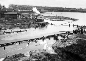 From the earliest years of white settlers’ arrival in Seattle in the 1850s, land speculators and businessmen were attracted to what is now the Fremont neighborhood at the northwest corner of Lake Union. A big advantage of the site was a stream which early settlers called The Outlet, flowing westward toward Puget Sound. Men such as homestead claimant William Strickler hoped to use water-power to float logs on the stream, out to the Sound and toward Yesler’s Mill on the downtown Seattle waterfront.