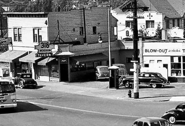 The 318 Nickerson Tavern in 1948, with McKale’s gas station at right. In the background is the Bleitz Funeral Home at 316 Florentia Street.