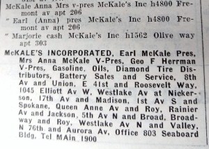 Earl McKale was a Fremont resident with one of his gas stations located next to the 318 Nickerson Tavern. Photo of Seattle City Directory page for the year 1938.