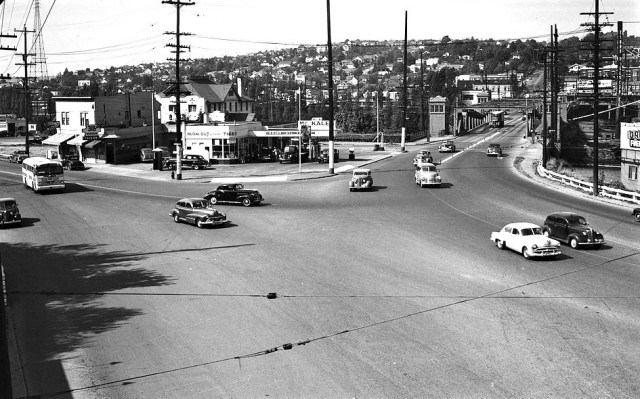 Approaching the Fremont Bridge, we see the visible Nickerson Street intersection with the tavern and gas station. Photo of 1949, Seattle Municipal Archives #18950A.
