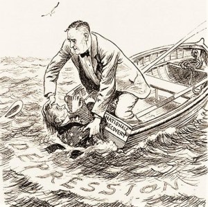 President Franklin D. Roosevelt is depicted as saving the USA from the waters of the economic depression of the 1930s.