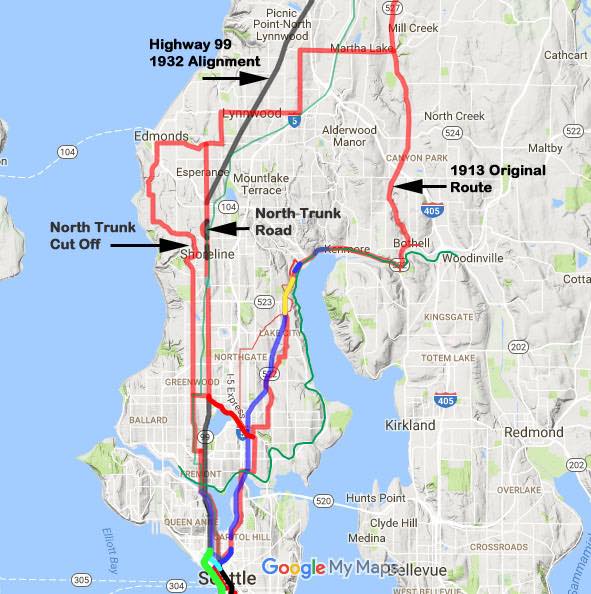 The Erickson Road, later called the Old Bothell Highway, is the red line to the right (east) of today’s Lake City Way NE (blue line). The route ran up 30th Ave NE and turned right (east) at the corner of NE 110th Street. The snaking green line along the shore of Lake Washington is the railroad route which is today’s Burke-Gilman Trail. Map courtesy of Pacific Highway Association.
