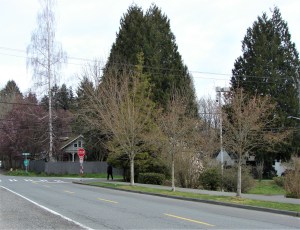 Today’s 30th Ave NE has a stop sign at NE 110th and the Yates house is across on the northeast corner of the intersection. On the right is Nathan Hale High School. Photo by Valarie.