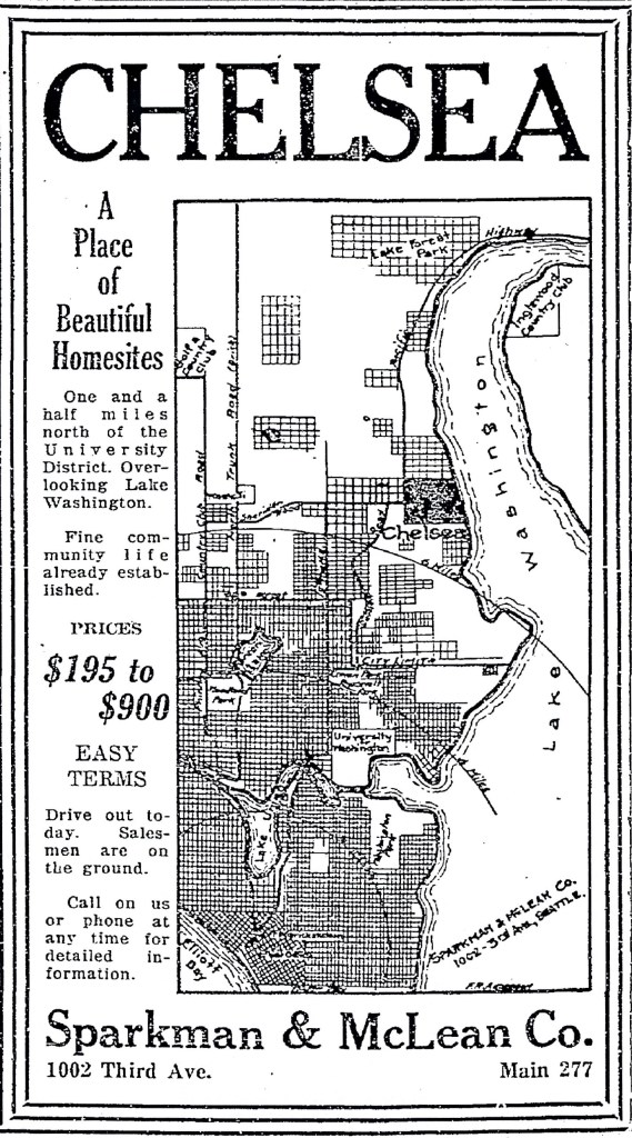 With the anticipation of increased car traffic out past their property in north Seattle, in 1916 the Yates named their community “Chelsea” and began running real estate sales ads in the newspaper.