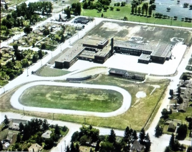 Looking southward, we see Jane Addams Middle School circa 1960. NE 110th Street is at the top of the photo showing the golf course property on the south side of NE 110th. The golf course later became the site of Nathan Hale High School.