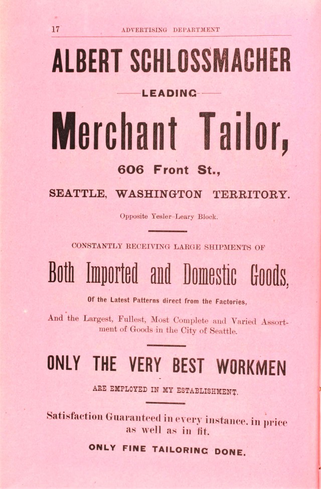 In 1885 Albert Schlossmacher arrived in Seattle, set up a tailor shop and ran ads in the Seattle Daily Intelligencer newspaper. His first location was advertised as “opposite the Yesler-Leary Building” in the heart of Seattle’s business district. The Yesler-Leary Building was on the west side of First Avenue, just north of Yesler Way. The address of Schlossmacher’s tailor shop on the east side of the street was 606 Front Street (now First Avenue.)