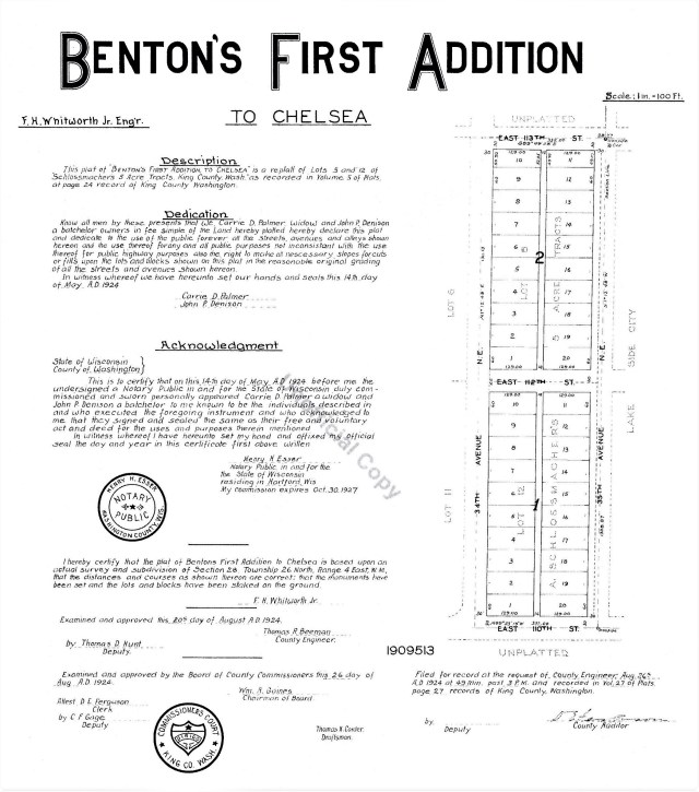 Carrie Palmer’s plat of Benton’s First Addition to Chelsea included land bordered by NE 110th Street on 34th and 35th Avenues NE, on the east side of today’s Jane Addams Middle School (the school was not there yet in 1924.)
