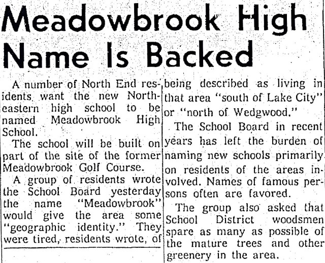 “Meadowbrook High Name is Backed.” Seattle Daily Times, October 26, 1961, page 26.