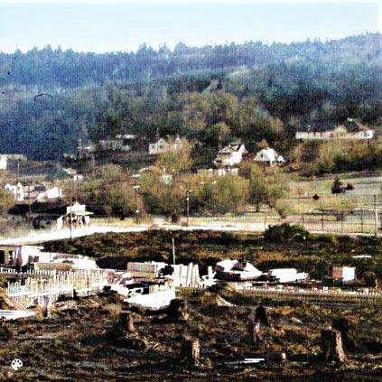 In this smaller section of a construction photo, we see Maple Leaf School at upper right. At left (dark roof) is the Chelsea Store.