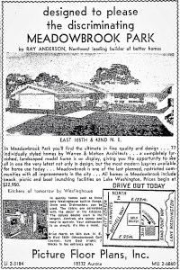 Developers began using the name for nearby plats of houses such as Meadowbrook Park and Meadowbrook Estates. These housing areas were not adjacent to NE 110th Street but were east of 35th Ave NE, showing that the concept of “Meadowbrook” had generalized itself over a wider area.