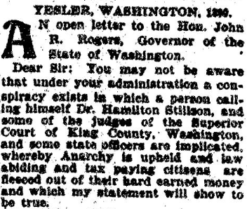 Herman Sommers, leaseholder of a portion of the land, wrote this letter protesting his inability to take possession of the land. Seattle Daily Times, July 16, 1899, page 18.
