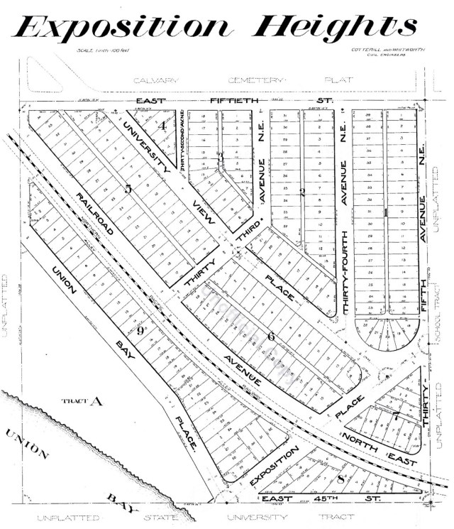 Exposition Heights, developed by Crawford & Conover Real Estate, is located by the train trestle where the road passes underneath from Union Bay Place to 35th Ave NE. This ramp-like road was originally named Exposition Place.