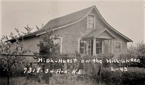 In 1903 Alexandrina bought a ten-acre tract of land in remote northeast Seattle, in the 7301 block between 33rd to 35th Avenues NE. The next nearest houses were at the Village of Yesler (today’s Laurelhurst) where there was a sawmill and a railroad stop. Perhaps Alexandrina thought that population growth would eventually extend out to her land site, although at the time of her purchase the only road was the unpaved 35th Ave NE. Alexandrina filed a plat (a map with a plan of house lots) and began selling the lots for income. The name of Alexandrina’s plat was Highhurst on the Hill.