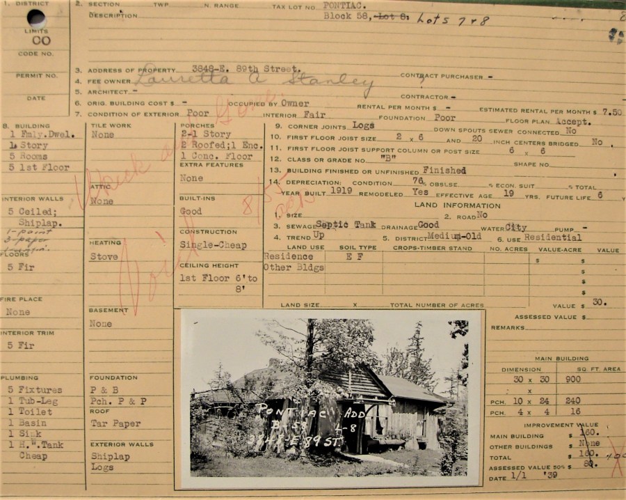 Property record card for Laurette Stanley’s house. These cards were created in a 1938 survey of all taxable structures in King County.