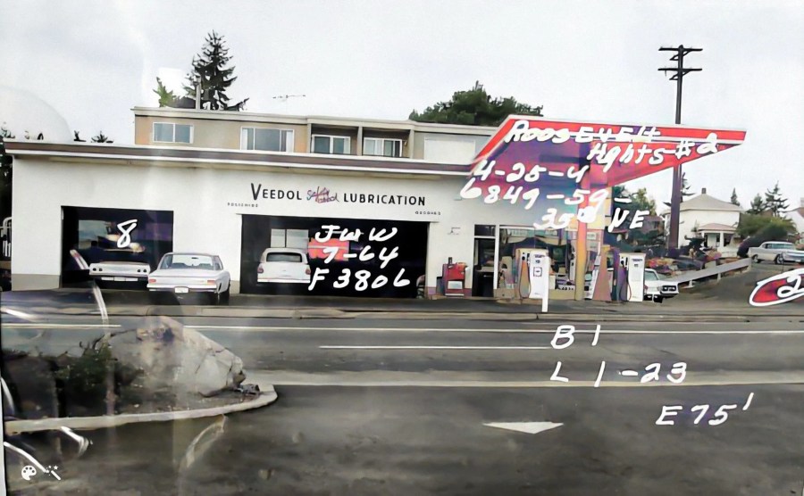 The canopy of this gas station, pictured in 1959, has been preserved in what is now the Top Pot Doughnut building.