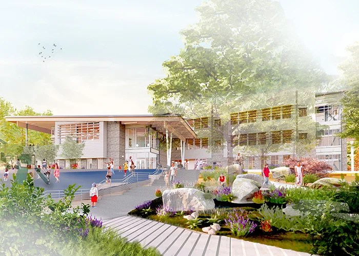 Design view of the new John Rogers School as approached from the south. A new driveway has been created to approach from NE 105th Street. Traffic will be segregated so that buses only will use the NE 109th Street entrance.