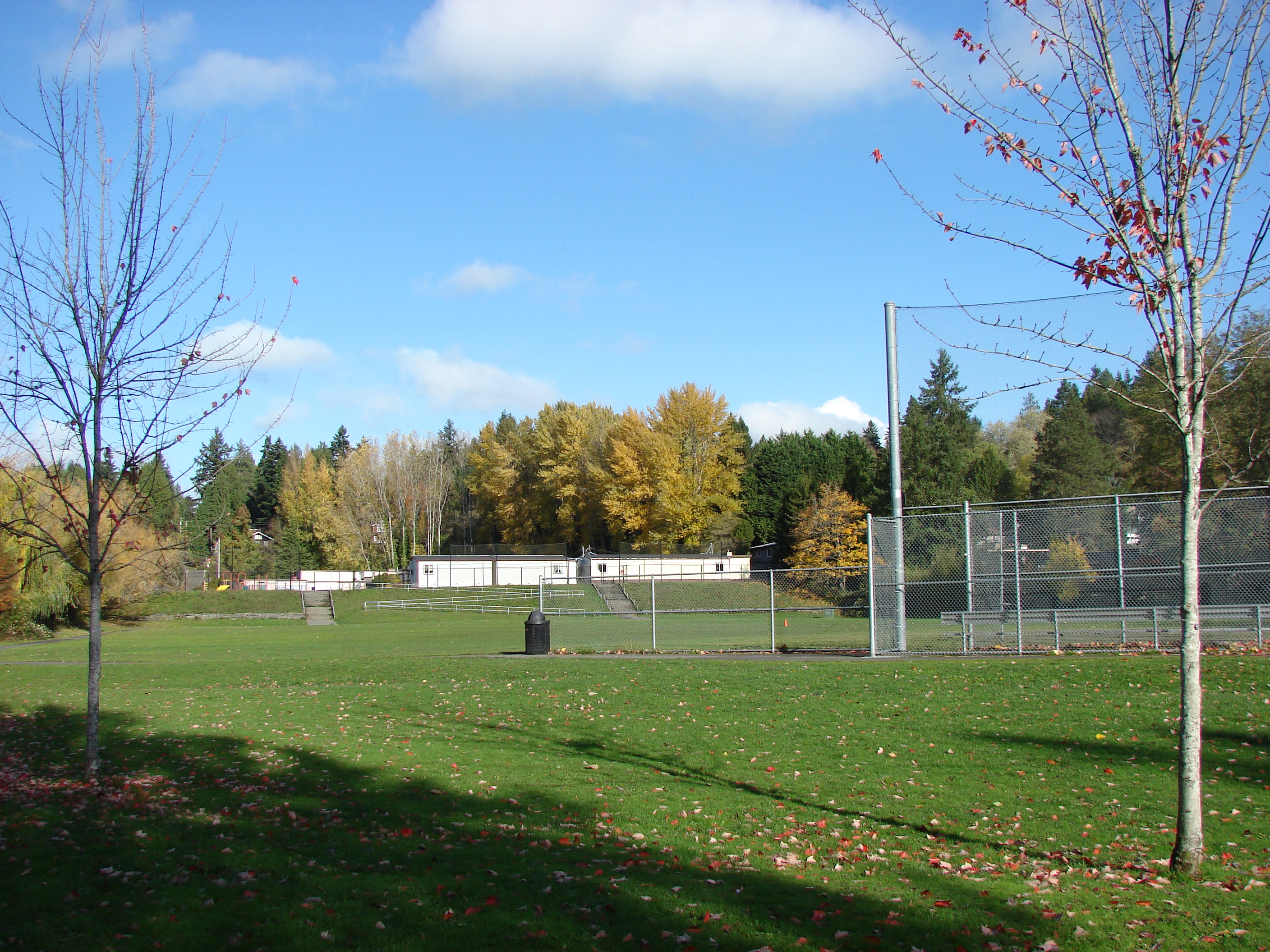 Rogers School has a field extending to NE 105th Street. From there we are looking northward to the school building.