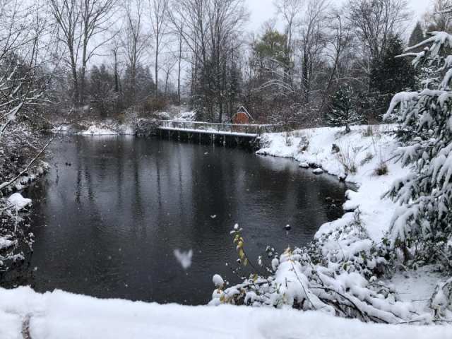 Meadowbrook Pond has a bridge and walkways for viewing the water. Photo by Michelle Lindsey via the Facebook page of Friends of Meadowbrook Pond, December 2021.
