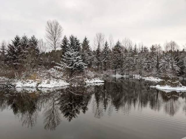 Meadowbrook Pond is beautiful in all seasons but in winter we can more easily see the expanded area created for floodwater retention. Photo by Yasmeen Hussain via the Facebook page of Friends of Meadowbrook Pond, December 2021.
