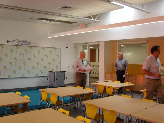 The new building has a geothermal system with heat pumps and use of LED light fixtures with “smart” lighting controls which will dim when no one is in the room or when natural light is sufficient. Each classroom has an exterior wall of windows and on the interior side along the hallway, there are windows which help let in light.