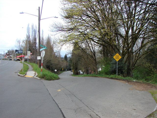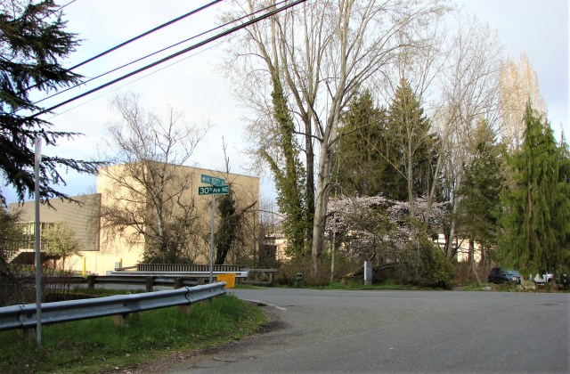 This street, 30th Ave NE alongside Nathan Hale High School, was once part of the Erickson Road highway to Bothell. At far left, at the corner of NE 110th Street, the highway continued eastward over to 35th Ave NE.