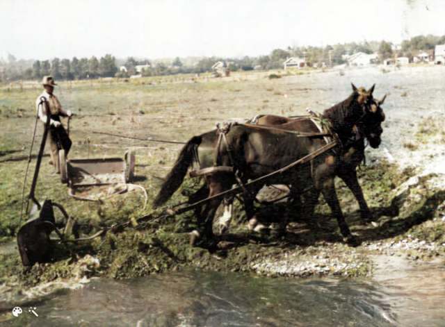 In the photo we are standing with our backs to the hillside of NE 105th Street, looking northward towards NE 110th Street. John MacLean guides his team of mules, Dick & Dobbin, as they dredge a channel for run-off water.