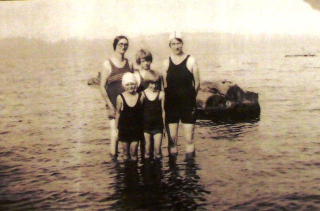 Swimming at Matthews Beach: in the 1930s swim suits were made of wool. Mrs. Land at left; Dorothy; eldest Land daughter Sadie Chilson; Lucille Chilson; Maxine, twelfth and last Land child.