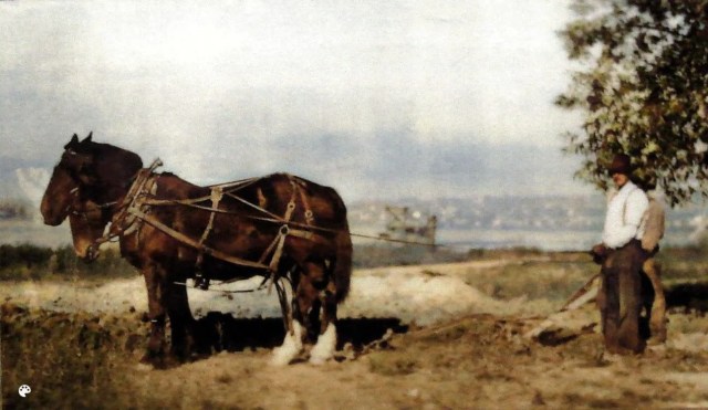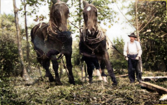 Roy Land with Doc and Dan, his team of horses, excavating for a house. The outline for the house can be seen at right. Photo courtesy of the Land family.