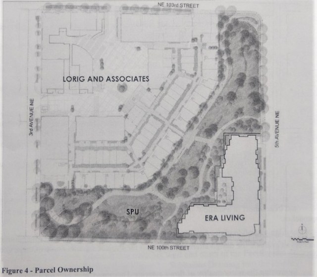 Looking east across the Thornton Creek Water Quality Channel, we see the pathways and viewing areas around the channel cut diagonally through the block. The buildings on the perimeter are: left: Thornton Place Apartments; center: Aljoya retirement community; right: Group Health building on the corner of 5th Ave NE and NE 100th Street.