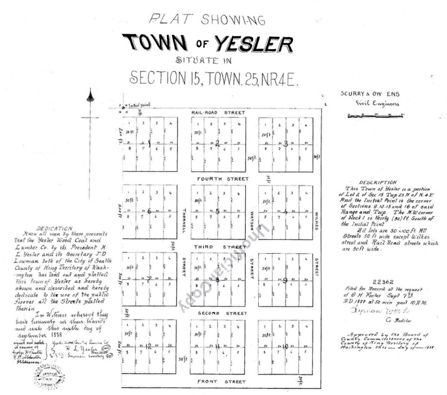 Town of Yesler plat map filed in 1888 by Yesler and his investor, J.D. Lowman. Top line of the map is NE 45th Street just east of the intersection of Union Bay Place NE.