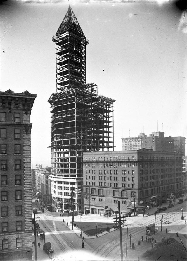 The national recognition of Seattle and the economic boost provided by the AYPE in 1909 led to a boom in building, including Seattle’s first steel-frame skyscraper, the Smith Tower.