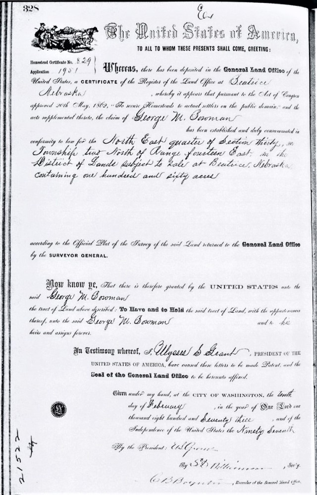 After his Civil War service with the Union Army ended in June 1865, Boman did not go back home to Tennessee to live. He lived a few years in Kentucky, where he took a new wife, Adelia. George & Adelia then went to Richardson, Nebraska, and lived there about seven years until they had “proved up the claim” and had been awarded ownership of the land. A land grant document was recorded for George Boman on February 10, 1873, meaning that he owned the land and could then sell it if he wanted.