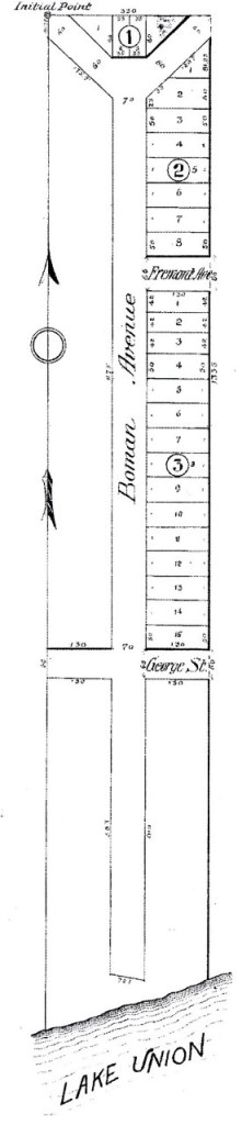 It is my belief that the reason why Adelia might not have known where George was living, was that sometime in 1882 he had moved to the north shore of Lake Union. Investors Corliss P. Stone, Milton Densmore and William Ashworth owned property there on both sides of what is now Stone Way, which we now think of as the dividing line of the Fremont and Wallingford neighborhoods. Boman bought a strip of land to the west of Stone Way and built a house there. Boman’s first house was on the northwest corner of what is now Woodland Park Ave North (Boman Avenue) and North 36th Street (George Street).