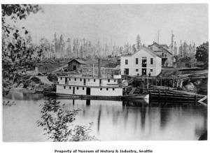Sternwheeler Nellie at Snohomish, WA, circa 1876. The Nellie did freight hauling on the Snohomish-Snoqualmie river systems and would enter Puget Sound at Everett. See also: Carnationwa.gov “Historic Overview: Carnation, Washington.’