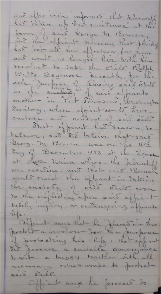 In December 1883 William Seymour, Mary’s estranged husband, appeared at the Boman house at Lake Union in Seattle, grabbed two-year-old Ralph and left the house, intending to take custody of his son.