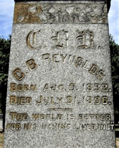Charles B. Reynolds died in 1896 and was buried in the Boman’s cemetery plot. This inscription is on the stone obelisk, “the world is better for his having lived in it.”