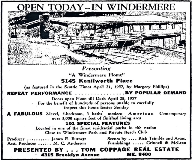 The Coppage family lived in their Hillcrest Manor house for many more years and they became active members of the Wedgwood community. In 1958 Tom Coppage moved his real estate office from the University District to Wedgwood’s business district at 8038 35th Ave NE. The building was next door to Woodlawn Optical and was torn down in 2016.